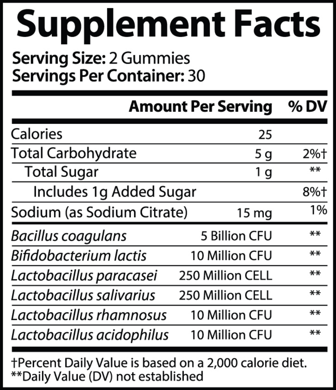 Our Probiotic Gummies are powered by 6 clinically studied probiotic strains — carefully chosen because they are strong, “good bacteria” that survive the harsh stomach acid and reach your gut alive, where they actually make a difference.